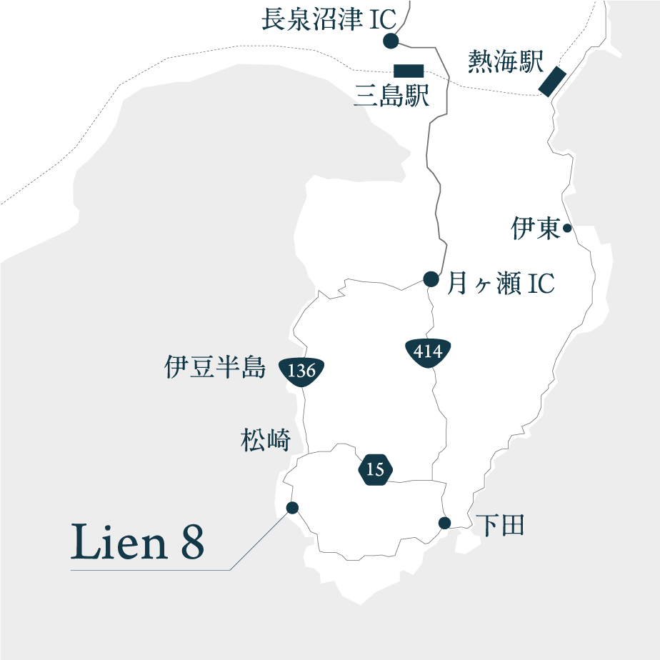 新東名高速道路→長泉沼津IC→伊豆縦貫道→月ヶ瀬IC→136号線で西伊豆方面→波勝崎方面→Lien8